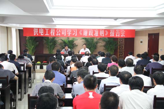 93,由公司牽頭主辦,在淮鹽大酒店舉行學(xué)習(xí)《廉政準(zhǔn)則》報告會,集團(tuán)公司黨委副書記、紀(jì)委書記鄭宜虎作了學(xué)習(xí)貫徹《廉政準(zhǔn)則》專題報告。會議由公司黨委書記、總經(jīng)理范益寶主持,集團(tuán)公司總部、供電工程公司、雙菱集團(tuán)、供銷公司有關(guān)人員參加了會議。