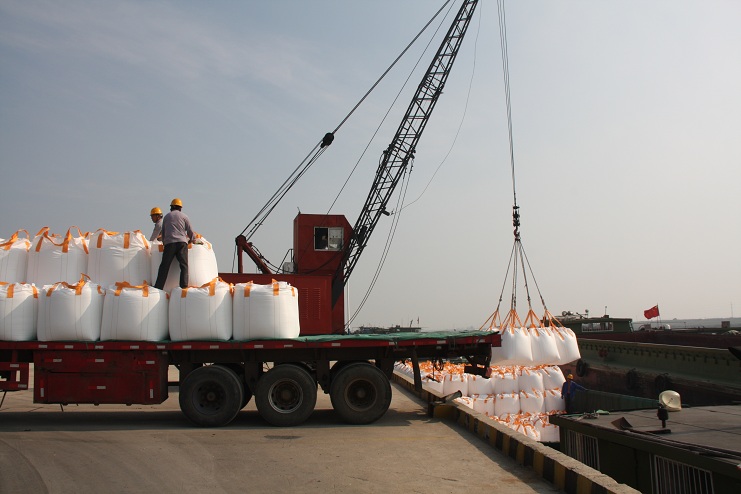 10月6日上午9時許,隨著一聲汽車長笛,一輛載有近40噸化工物資的卡車徐徐??吭谙笪锪鞴疚骞嗪哟a頭邊,緊接著碼頭鐵臂起舞,機械操作工宋成龍、楊棟梁嫻熟地操縱著塔吊機械,王緒銀、駱公友等職工敏捷地指揮吊臂準確地將一包包噸貸物資裝卸在碼頭邊的貨船中。。。。。。自此,一輛輛滿載噸袋物資的卡車便不停地駛進碼頭。