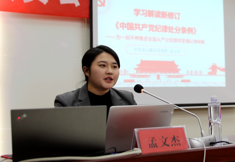學《條例》,明紀律。特邀請市委黨校孟文杰老師,對新修訂的《中國共產黨紀律處分條例》進行專題輔導。孟老師從深刻理解《條例》修訂的重要亮點、準確把握《條例》修訂的主旨要義、切實抓好《條例》的貫徹執(zhí)行三個方面作了精彩解讀,并堅持理論密切聯系實際,結合與修改內容相關的案例及視頻,提醒廣大黨員干部嚴于律己、防微杜漸,讓全體黨員干部受益匪淺。