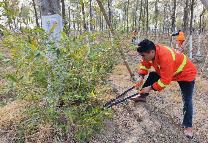 當(dāng)前,為扎實(shí)做好冬季樹木養(yǎng)護(hù)工作,提高樹木的過冬、抗病和抗蟲能力,李傳武帶領(lǐng)班組全員開展樹木涂白行動,悉心為樹木披上“防寒衣”。為達(dá)到同一標(biāo)準(zhǔn),他采用“立桿涂白法”,首先安排專人進(jìn)行劃線,將行道樹涂白高度統(tǒng)一控制在1.2米,使區(qū)域內(nèi)涂白高度保持一致,確保樹木涂白效果與植物整體美觀,經(jīng)過10天的持續(xù)工作,完成10000余棵行道樹涂白工作(完成工作量約20%)。